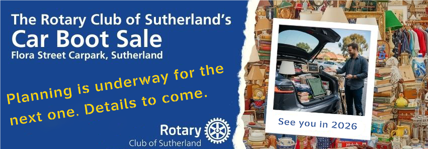 🚗💥 Sutherland Rotary is turning the car park into a treasure hunt! We’re hosting a Car Boot Sale to raise funds for our local community, and we're welcoming anyone who wants to be a seller to come and help us give back.